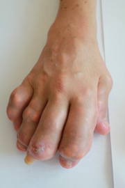 Среднестатистический пациент с подагрой обращается к специалисту на 7-ой год болезни. Как правило, к этому времени приступы приобретают затяжной характер, захватывают крупные суставы, не купируются традиционной обезболивающей и противовоспалительной терапией. Развитие болезни связано с повышением содержания мочевой кислоты в организме. Повышения уровня мочевой кислоты в крови может быть вследствие увеличения ее образования в организме, либо замедления выведения из организма. Избыток мочевой кислоты накапливается в суставах в виде кристаллов урата натрия, в почках - в виде уратных камней. Отложение кристаллов урата натрия может происходить также под кожей в виде подагрических узлов - тофусов. Тофусы могут вскрываться с выделением желтовато-белого кашицеобразного содержимого ( кристаллов урата натрия). Наличие тофусов свидетельствует, как правило, о более тяжелой, «запущенной» форме болезни, которая дольше и сложнее лечится.